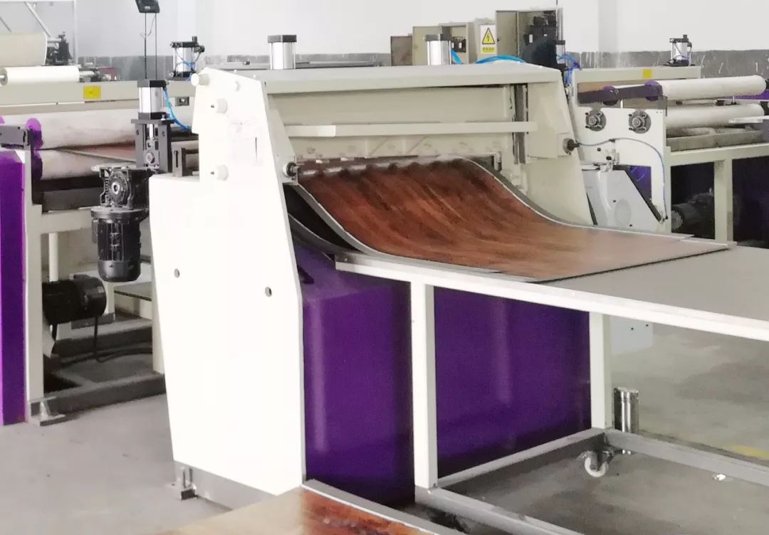 3. Six-roller composite forming machine: 3.1 Use section composite design, which could reduce the stretching of surface’s laminating material. 3.2 Innovative heating transitional roller could ensure the composition strength of thick wear-resisting layer. 3.3 The good installation design of embossing roller could ensure the good effect of embossing and more convenience to change the roller.4. Tempering and water absorbing haul off unit.   4.1Through the on-line tempering design, could control the product’s flatness and shrinkage effectively. 4.2 Through the on-line tempering design, could control the product’s flatness and shrinkage effectively. 5. Automatic length fixing cutter. 5.1 The entrance of cutter have the design of auxiliary haul off, that could better control the cutter board’s stability. 5.2 The special design of cutting could reduce the burrs of product’s end face as much as possible. 5.3 The function of automatic length fixing could be operated easily and have high cutting precision.